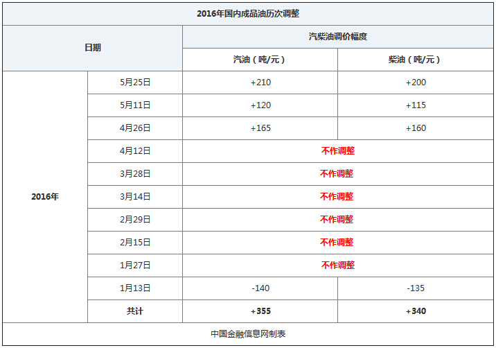 5月25日,國內成品油調價窗口開啟。國家發改委發布通知指出,根據近期國際市場油價變化情況,按照現行成品油價格形成機制,自2016年5月25日24時起,國內汽、柴油價格(標準品)每噸分別提高210元和200元。