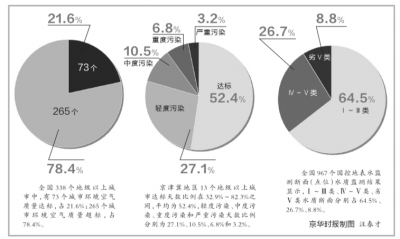 2015年,京津冀地區(qū)13個地級以上城市達標(biāo)天數(shù)比例在32.9%~82.3%之間,平均為52.4%,比2014年上升9.6個百分點。輕度污染、中度污染、重度污染和嚴(yán)重污染天數(shù)比例分別為27.1%、10.5%、6.8%和3.2%。