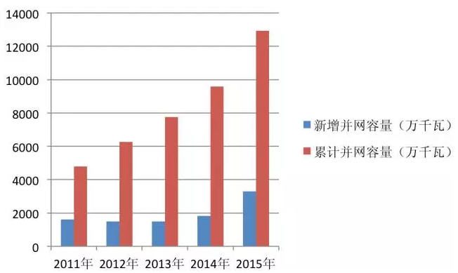 與裝機(jī)容量相比,并網(wǎng)容量所反映的市場(chǎng)情況具有滯后性,但能體現(xiàn)出有多少風(fēng)電機(jī)組已經(jīng)可以用于發(fā)電。2015年中國(guó)風(fēng)電新增并網(wǎng)容量達(dá)到了3297萬(wàn)千瓦,比2014年的1823萬(wàn)千瓦增加明顯。2015年累計(jì)并網(wǎng)容量為12934萬(wàn)千瓦,與新增并網(wǎng)容量一樣,其增幅是近五年中最高的。