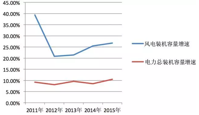 圖2 歷年中國(guó)電力總裝機(jī)容量和風(fēng)電裝機(jī)容量增速對(duì)比