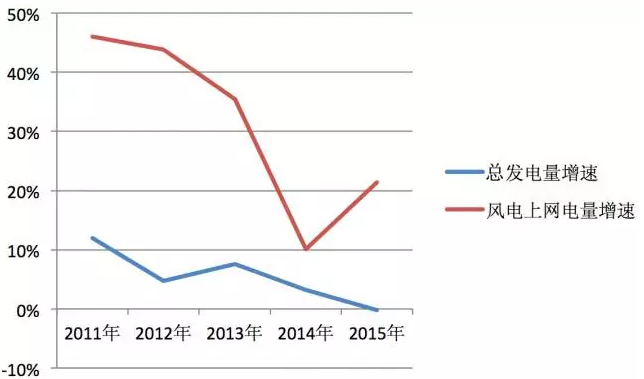 2015年全國(guó)總發(fā)電量為56184億千瓦時(shí),相比2014年的56496億千瓦時(shí)有所下降,也是近些年來(lái)全國(guó)總發(fā)電量的首次下降。與全國(guó)總發(fā)電量下降相比,2015年風(fēng)電上網(wǎng)電量再創(chuàng)新高,達(dá)到了1863億千瓦時(shí)。2015年的風(fēng)電上網(wǎng)電量并非近五年增幅最高的,相比于2011年45%以上、2012年40%以上和2013年35%以上的增長(zhǎng)幅度,2015年風(fēng)電上網(wǎng)電量同比增長(zhǎng)相差甚遠(yuǎn),僅超過(guò)了20%。但這已經(jīng)比2014年的10%的增幅提高了不少。這樣的發(fā)電量增長(zhǎng)速度,是在全國(guó)電力需求放緩的背景下獲得的,顯得更為不易。