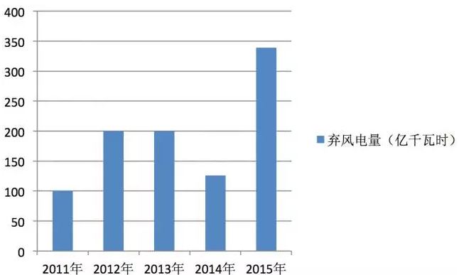 2015年的棄風(fēng)率與2013年和2014年相比又有了明顯升高,達(dá)到了15%。雖然公開(kāi)數(shù)據(jù)顯示棄風(fēng)率并不是近五年中最高的,但由于機(jī)組并網(wǎng)容量逐年提高,棄風(fēng)電量在2015年創(chuàng)出歷史之最,達(dá)到了339億千瓦時(shí),比2014年高出一倍以上。2015年因棄風(fēng)所造成的經(jīng)濟(jì)損失嚴(yán)重,電費(fèi)損失達(dá)183億元,折合標(biāo)煤1088萬(wàn)噸。相當(dāng)于2000萬(wàn)千瓦的風(fēng)電裝機(jī)被浪費(fèi),也就是400個(gè)5萬(wàn)千瓦風(fēng)電場(chǎng)一年的電費(fèi)收入白白損失掉,意味著2015年三分之二的新增裝機(jī)容量沒(méi)有產(chǎn)生任何效益。