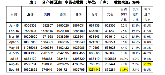 一、從臺灣進口多晶硅量連續9個月維持在千噸以上,4月份更是增加至1941噸,創歷史新高,占總進口量的16.0%,較以往正常進口量增加兩倍以上,5月份也維持在1511噸的高位,占總進口量的14.9%。正是由于通過臺灣進口規避“雙反”征稅的方式已經逐漸成為主流,且愈發猖狂,所以即便從美國進口量大幅減少,自美國和臺灣進口量之和也仍在2000噸/月左右,與美國未減少之前無異。而眾所周知臺灣并沒有多晶硅生產企業,但海關數據中臺灣卻作為原產地出現,只因海關8位編碼不能將多晶硅與鑄錠區分開來,而臺灣又恰好有鑄錠企業,因此使得調查困難重重。