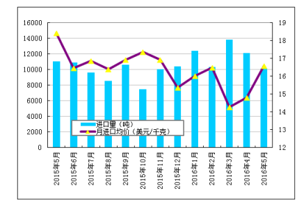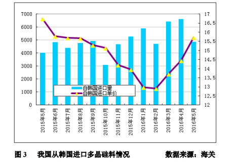 2016年5月份從韓國進口多晶硅量為4875噸,環比增加26.3%;進口單價微幅回升至15.72美元/千克,環比上漲為8.7%。