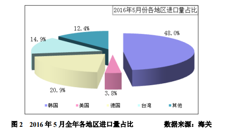 5月份從韓國進口量為4875噸,占總進口量的48.0%;從美國進口量為383噸,占總進口量的3.8%;從德國進口量為2127噸,占總進口量的20.9%;從臺灣進口量為1511噸,占總進口量的14.9%;其他地區進口量為1263噸,占總量的12.4%。