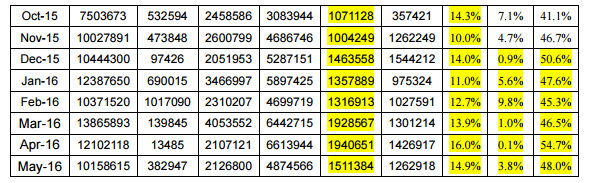 根據海關最新數據統計,2016年5月份我國多晶硅進口量維持在萬噸以上,達到10159噸,環比減少16.1%,1-5月累計進口多晶硅58886噸,同比增加19.8%。導致累計進口量不斷刷新增幅記錄的原因有:第一,從韓國進口量居高不下,在進口總量中占比一直維持在50%左右的高位,保持最大進口來源地,尤其是4月份從韓國進口多晶硅量創歷史新高達到6614噸,占總進口量的54.7%,5月進口量為4875噸,占總進口量的48.0%;第二,從臺灣進口多晶硅占比日漸增加,4月份從臺灣進口量為1941噸,創歷史新高,占總進口量的16.0%,5月份進口1511噸,占比同樣維持在14.9%的高位,位居我國第三大進口地區。綜上,自韓國、臺灣進口量長期維持高位,是導致總進口量不斷創新高的主要因素。