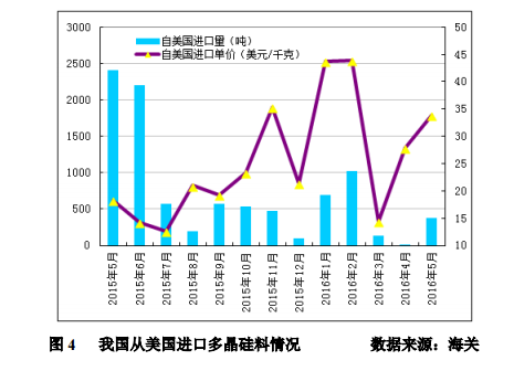 2016年5月份從美國進口多晶硅量為383噸,環比大幅增加28.5倍;5月份進口單價大幅增加至33.91美元/千克,環比增幅為21.7%。