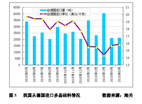 2016年1-5月份從德國累計進口多晶硅量為14065噸,同比減少2.4%;累計進口均價為15.27美元/千克,同比下滑29.9%。