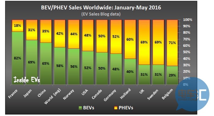 圖:全球各國2016上半年純電動&混合動力乘用車市場比例