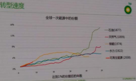 戴思攀表示,石油花了45年時間才在全球能源中占到10%,回顧每種能源發展的歷史,每種新的能源滲透入全球能源市場并占可觀的比重是需要很長時間的??稍偕茉窗恕⒕拍昵安胚_到1%的比重,目前發展趨勢和過去傳統能源發展趨勢是類似的。根據報告,在今后的20年中,可再生能源將比任何一種能源在任何一個發展階段的趨勢都更加迅猛,不過想要達到可觀的比重仍需很長時間。戴思攀指出,去年全球經濟放緩和能源結構的調整都促進了碳排放的放緩,這些都有助于巴黎氣候協定目標的實現。