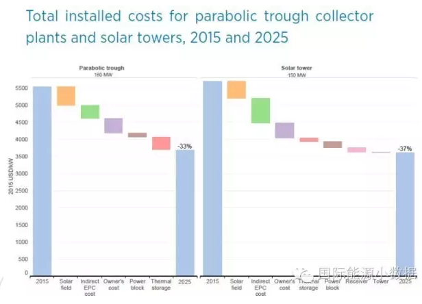 光伏成本持續(xù)下降,那么光熱發(fā)電成本如何變化呢?以7.5-9小時儲能容量為例,160兆瓦槽式光熱電站裝機成本可望下降33%,從5.5美元/瓦下降到3.6美元/瓦;而150兆瓦塔式光熱電站成本可望下降37%,從大約5.7美元/瓦降至3.6美元/瓦。