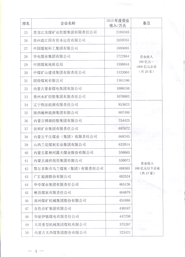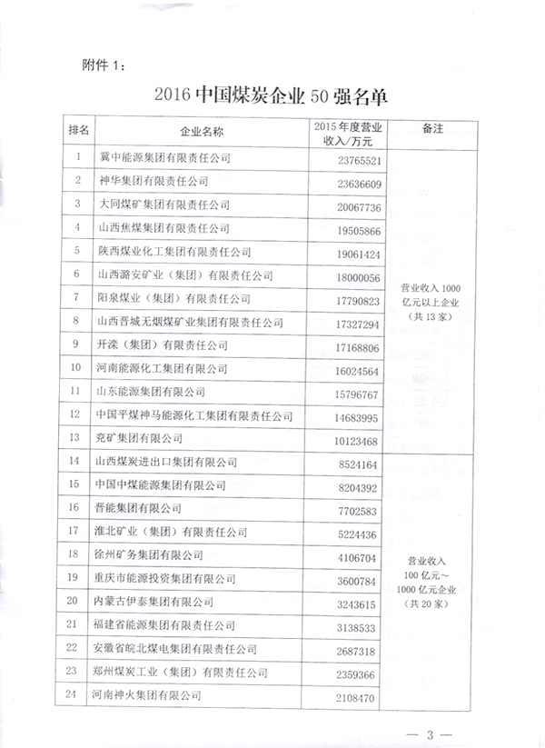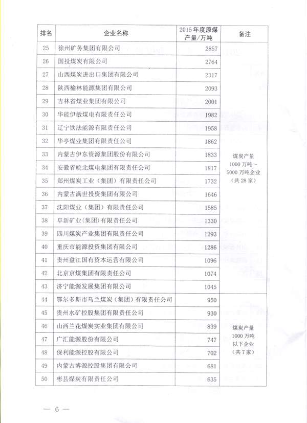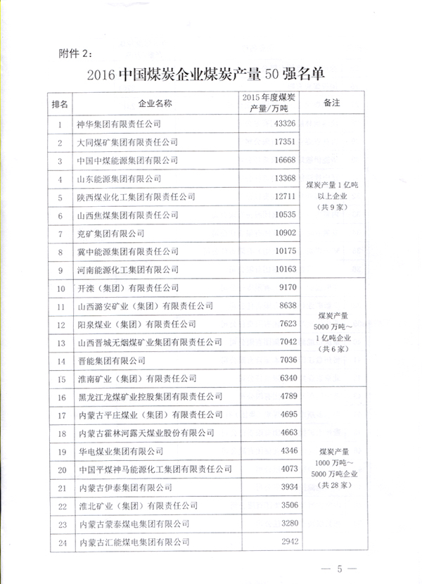 2016年中國煤炭企業(yè)50強以2015年度營業(yè)收入為入圍標準,煤炭產(chǎn)量50強以2015年度煤炭產(chǎn)量為入圍標準。