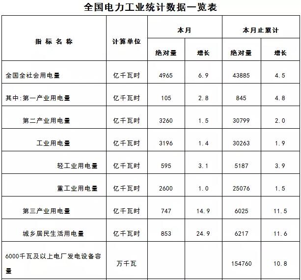 10月17日,國(guó)家能源局發(fā)布9月份全社會(huì)用電量4965億千瓦時(shí),同比增長(zhǎng)6.9%;1-9月,全國(guó)全社會(huì)用電量累計(jì)43885億千瓦時(shí),同比增長(zhǎng)4.5%。