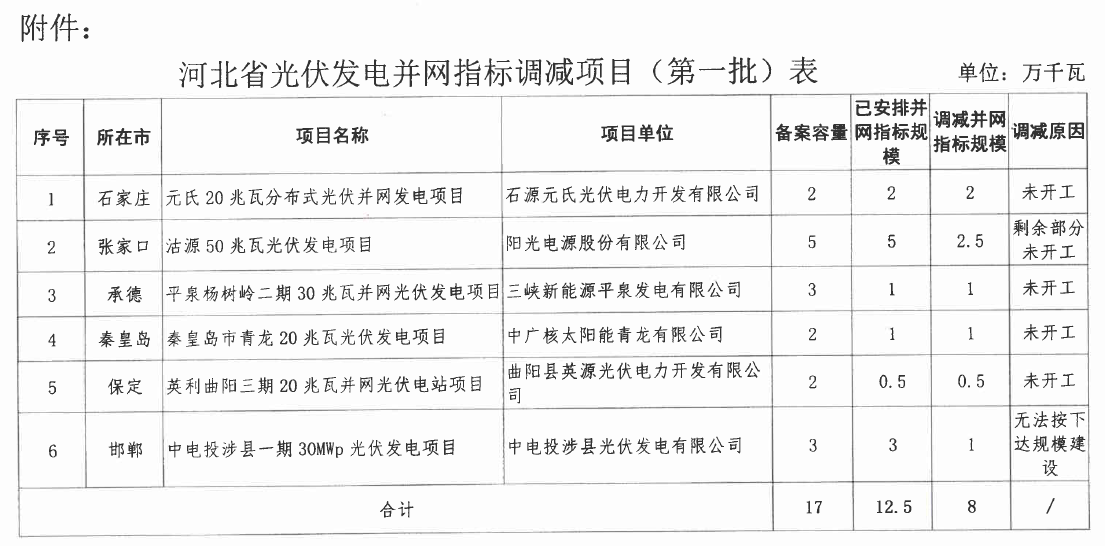 附件:河北省光伏發電并網指標調減項目(第一批)表