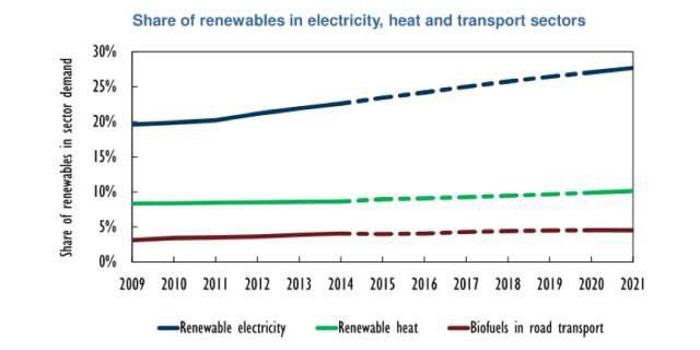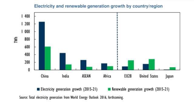國際能源署在報告中稱,2015-2021年期間,可再生能源增速比其此前預測值要高出13%,因為可再生能源得到了中國、美國、印度、墨西哥等國政策的強力支持。在該預測期內,太陽能光伏成本預計將下滑25%,而陸上風電成本則下降15%。