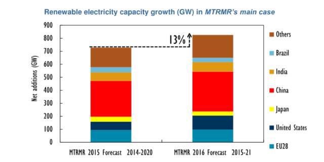 國際能源署(IEA)上周二發布的2016中期可再生能源市場報告稱,2015年可再生能源超過煤炭,成為全球范圍內新增發電裝機容量的最大來源,并且預計可再生能源裝機容量在未來五年也將實現持續增長。