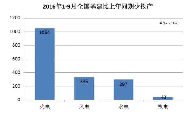 1-9月份,全國基建新增發電生產能力7270萬千瓦,比上年同期少投產159萬千瓦。其中,水電788萬千瓦、火電2901萬千瓦、核電503萬千瓦、風電824萬千瓦,分別比上年同期少投產297、1054、43和335萬千瓦。