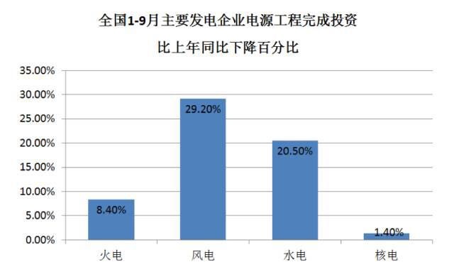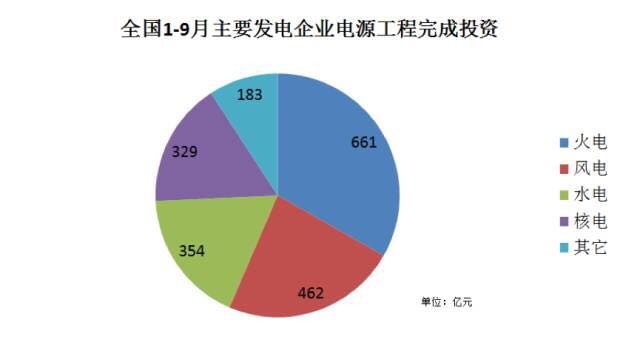 1-9月份,全國主要發電企業電源工程完成投資1989億元,比上年同期下降10.9%。各個類別的電源完成投資都有下降,水電完成投資354億元,同比下降20.5%;火電完成投資661億元,同比下降8.4%;風電完成投資462億元,同比下降29.2%;核電完成投資329億元,同比下降1.4%。