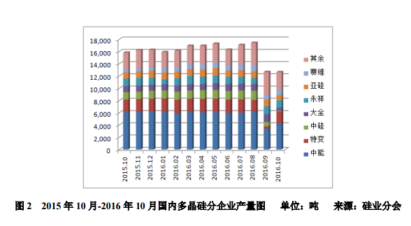 二、國內(nèi)“檢修潮”待續(xù),供應(yīng)同比下降硅業(yè)分會統(tǒng)計,2016年9-10月份國內(nèi)多晶硅產(chǎn)量為2.53萬噸,同比減少18.1%。9月份產(chǎn)量為1.27萬噸,10月份產(chǎn)量為1.26萬噸,環(huán)比分別下降27.0%和0.8%。9-10月份按產(chǎn)量排序,江蘇中能、四川永祥和新特能源分別位居前三位,這三大企業(yè)產(chǎn)量占總產(chǎn)量的49.2%。中能、特變、中硅、大全、永祥、亞硅、賽維七家萬噸級企業(yè)產(chǎn)量為1.87萬噸,占國內(nèi)總產(chǎn)量的73.7%。9-10月份國內(nèi)在產(chǎn)企業(yè)有17家,其中陸續(xù)檢修的企業(yè)達(dá)到8家(包括:江蘇中能、新特能源、洛陽中硅、新疆大全、內(nèi)蒙盾安、亞洲硅業(yè)、國電晶陽、昆明冶研),到10月底有3家企業(yè)檢修結(jié)束,并正逐步恢復(fù)正常產(chǎn)量,其余計劃于11月份結(jié)束檢修技改并逐漸實現(xiàn)滿產(chǎn)。從各企業(yè)生產(chǎn)情況看,江蘇中能9月初在多晶硅價格創(chuàng)歷史新低時將產(chǎn)能減少三分之一,月產(chǎn)量減少2000噸/月左右,目前尚未恢復(fù)生產(chǎn),計劃于11月份復(fù)產(chǎn);新特能源新線技改計劃于11月份告一段落,月產(chǎn)量將提高14%左右;洛陽中硅從9月中旬至10月中旬檢修約1個月,于10月下旬恢復(fù)生產(chǎn);內(nèi)蒙盾安和國電晶陽已于10月底檢修結(jié)束恢復(fù)正常生產(chǎn),其中內(nèi)蒙盾安檢修后產(chǎn)能有些許提升;新疆大全、亞洲硅業(yè)、昆明冶研目前仍在技改階段,預(yù)計部分將于11月份恢復(fù)。