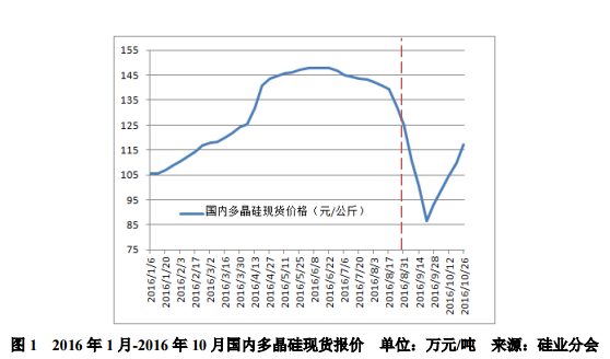 一、多晶硅價格呈“V型”走勢2016年9-10月份多晶硅價格呈“V型”走勢,從9月初的11.06萬元/噸下滑至9月第三周的8.65萬元/噸,跌幅高達(dá)21.8%,9月第四周多晶硅價格觸底反彈,逐漸回升到10月底的11.73萬元/噸,漲幅為35.6%。10月份月均價11.05萬元/噸,環(huán)比上漲13.0%。導(dǎo)致9月份國內(nèi)多晶硅價格呈下跌走勢的原因有:第一,“6˙30”搶裝潮結(jié)束后,從7月份開始,下游需求進(jìn)入前所未有的低迷狀態(tài),組件、電池片和硅片環(huán)節(jié)都陸續(xù)積累了不同程度的庫存,下游各環(huán)節(jié)價格一路下跌,企業(yè)利潤大幅縮水,停產(chǎn)減產(chǎn)現(xiàn)象普遍,因此直接導(dǎo)致多晶硅價格一路走低,一直延續(xù)到9月份。第二,部分大廠由于仍有待執(zhí)行的原有訂單,略微延后檢修計劃,使得供應(yīng)仍然充足,在需求急速疲軟的情況下,這也成為多晶硅價格快速下跌的直接助力。支撐多晶硅價格觸底反彈的因素有:第一,受制于下游庫存積壓,需求急速疲軟,部分多晶硅一線大廠主動減產(chǎn)檢修,供應(yīng)大幅減少。第二,多晶硅價格跌破歷史新低,部分下游廠商著手囤貨,對市場需求有一定刺激作用。第三,終端需求逐步恢復(fù),下游電池片組件企業(yè)逐漸復(fù)產(chǎn),實質(zhì)需求增加。第四,“關(guān)于新能源標(biāo)桿上網(wǎng)電價調(diào)整”的通知出臺,對光伏終端安裝的提早進(jìn)行有一定刺激。以上因素支撐了多晶硅價格“觸底反彈”。
