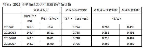 四、光伏補(bǔ)貼下調(diào)成必然,技術(shù)創(chuàng)新是出路國家發(fā)改委出臺《關(guān)于調(diào)整新能源標(biāo)桿上網(wǎng)電價的通知(征求意見稿)》,擬對新能源標(biāo)桿上網(wǎng)電價進(jìn)行調(diào)整,規(guī)定擬于2017年1月1日執(zhí)行。以光伏地面電站上網(wǎng)電價調(diào)整為例:I類資源區(qū)0.55元/千瓦時、II類資源區(qū)0.65元/千瓦時、III類資源區(qū)0.75元/千瓦時,相比現(xiàn)行的電價標(biāo)準(zhǔn)分別降低了0.25元、0.23元和0.23元,分別較現(xiàn)行補(bǔ)貼有31%、26%以及23%的跌幅,遠(yuǎn)超市場預(yù)期。光伏補(bǔ)貼電價的下調(diào),是最初光伏補(bǔ)貼政策就確立的趨勢,因為光伏補(bǔ)貼的最終目的是為了讓光伏發(fā)電成本支撐平價上網(wǎng),讓光伏發(fā)電在無需補(bǔ)貼的情況下可與火力發(fā)電等傳統(tǒng)能源模式在相同環(huán)境下競爭。而事實上,補(bǔ)貼逐步下調(diào)也確5/6實會倒逼企業(yè)改進(jìn)技術(shù)、提高發(fā)電效率、降低光伏度電成本,集中精力提高產(chǎn)品效率和品質(zhì)。生產(chǎn)成本逐漸下降是企業(yè)發(fā)展的關(guān)鍵因素,據(jù)統(tǒng)計,光伏組件成本從1.32元/千瓦時降到2016年一季度的0.41元/千瓦時,僅僅用了5年,到2017年四季度,該成本可能降到0.29元/千瓦時。光伏組件度電成本的下降,從長遠(yuǎn)來看,于政府于企業(yè)都是利好消息。首先,成本下降意味著政府對光伏企業(yè)的補(bǔ)貼就會減少,這也在一定程度上減輕了政府的財政壓力。其次,對于企業(yè)而言,組件成本的下降代表的是企業(yè)議價能力的提升。要降低生產(chǎn)成本,技術(shù)創(chuàng)新是根本途徑,只有不斷創(chuàng)新,才能降低光伏發(fā)電成本,光伏行業(yè)才能真正實現(xiàn)市場化,而不是靠補(bǔ)貼“續(xù)命”。補(bǔ)貼下調(diào),正是要倒逼企業(yè)創(chuàng)新。因此,長期來看,補(bǔ)貼和電價下調(diào)不可避免,從技術(shù)、應(yīng)用、商業(yè)模式等方面尋求創(chuàng)新才是唯一出路。五、多晶硅后市預(yù)測9-10月份國內(nèi)陸續(xù)檢修的企業(yè)達(dá)到8家(包括:江蘇中能、新特能源、洛陽中硅、新疆大全、內(nèi)蒙盾安、亞洲硅業(yè)、國電晶陽、昆明冶研),到10月底僅有3家企業(yè)檢修結(jié)束,正逐步恢復(fù)正常產(chǎn)量,其余計劃于11月份結(jié)束檢修技改,達(dá)到正常產(chǎn)量的時間大約在11月中下旬,預(yù)計11月份國內(nèi)多晶硅供應(yīng)將略低于8月份之前的高點但會高于10月份的最低點。考慮到上網(wǎng)電價調(diào)整政策擬于2017年1月1日開始執(zhí)行,這對光伏終端安裝的提早進(jìn)行有一定刺激作用,因此預(yù)計到2016年年底之前,下游需求有一定支撐,多晶硅價格也將維穩(wěn)在10-12萬元/噸之間。