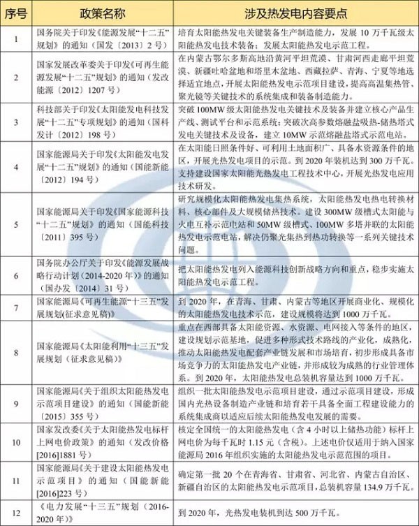 “十二五”以來,國家層面、國家發展改革委、能源局和科技部先后出臺多項規劃和政策支持太陽能熱發電產業發展,具體政策匯總見下表: