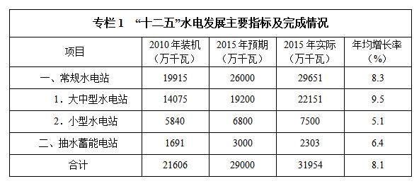 ——裝機規(guī)模不斷躍升。“十二五”期間,新增水電投產(chǎn)裝機容量10348萬千瓦,年均增長8.1%,其中大中型水電8076萬千瓦,小水電1660萬千瓦,抽水蓄能612萬千瓦。到2015年底,全國水電總裝機容量達到31954萬千瓦,其中大中型水電22151萬千瓦,小水電7500萬千瓦,抽水蓄能2303萬千瓦,水電裝機占全國發(fā)電總裝機容量的20.9%。2015年全國水電發(fā)電量約1.1萬億千瓦時,占全國發(fā)電量的19.4%,在非化石能源中的比重達73.7%。