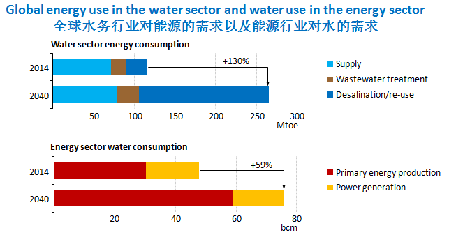 同時,水務行業(yè)也越來越多的需要能源。2014年,全球用電量4%用于提取,分配和處理廢水,并且使用5000萬噸柴油用于海水淡化廠。到2040年,水務部門使用的能源量預計還將增加一倍以上。在中東和北非,海水淡化能力急劇上升,對廢水處理(和更高水平的處理)的需求也在增長,特別是在新興經(jīng)濟體。到2040年,中東16%的用電與供水有關。管理好能源和水的聯(lián)系對成功實現(xiàn)發(fā)展的范圍和氣候目標十分重要。