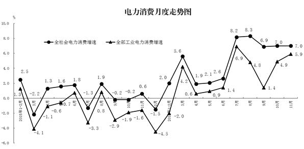 11月份,全社會(huì)用電量同比增長(zhǎng)7.0%,增速與上月持平。1-11月份,全社會(huì)用電量同比增長(zhǎng)5.0%,比上年同期加快4.3個(gè)百分點(diǎn)。