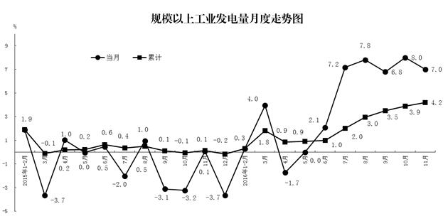 11月份,規(guī)模以上工業(yè)發(fā)電量同比增長(zhǎng)7.0%,增速比上月回落1.0個(gè)百分點(diǎn)。1-11月份,規(guī)模以上工業(yè)發(fā)電量同比增長(zhǎng)4.2%,比上年同期加快4.1個(gè)百分點(diǎn)。