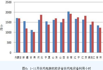 分類型看,1-11月份,全國水電設備平均利用小時3334小時,同比增加78小時;水電裝機容量超過1000萬千瓦的7個省份中,湖南、湖北和云南的水電設備平均利用小時同比分別增加444、233和92小時,青海、廣西、貴州和四川的水電設備平均利用小時同比分別降低607、432、426和79小時。全國火電設備平均利用小時3756小時,同比降低204小時;分省份看,全國共有13個省份火電利用小時數超過全國平均水平,其中,山東(4727小時)、江蘇(4648小時)和河北(4546小時)火電利用小時超過4500小時,而云南和西藏火電利用小時數分別為1095和73小時;與上年同期相比,除河北、北京、江蘇和西藏4個省份外,其他省份火電設備利用小時均有不同程度降低,其中,降幅超過1000小時的省份有海南(-1266小時)和青海(-1087小時),降幅超過500小時的省份有福建(-676小時)和四川(-540小時)。全國核電設備平均利用小時6378小時,同比降低385小時。全國風電設備平均利用小時1573小時,同比降低39小時。