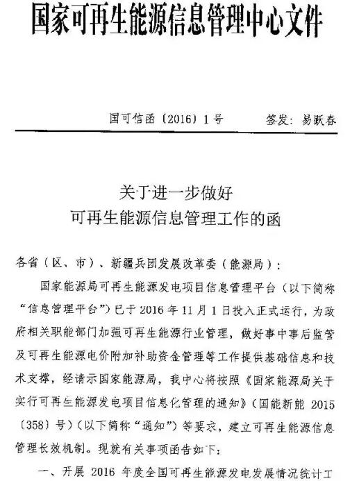 近日國家可再生能源信息管理中心發布《關于進一步做好可再生能源信息管理工作的函》。文件指出開展2016年度全國可再生能源發電發展情況統計工作。請各省級能源主管部門明確可再生能源信息統計工作聯系人,于2017年1月5日前將2016年度轄區內可再生能源發電項目核準(備案)及建設運行情況電子版報送日國家可再生能源信息管理中心。以下為文件原文: