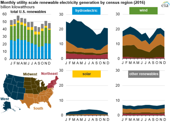 從發電量來看,今年3月份,美國可再生能源發電量達到全年最高。從地方來看,大部分可再生能源來自西部地區,尤其是水電(占63%)和太陽能發電(占77%)。風電產業相對發展比較均衡,中部地區占37%,南部占35%,西部占24%,東北部地區占4%。