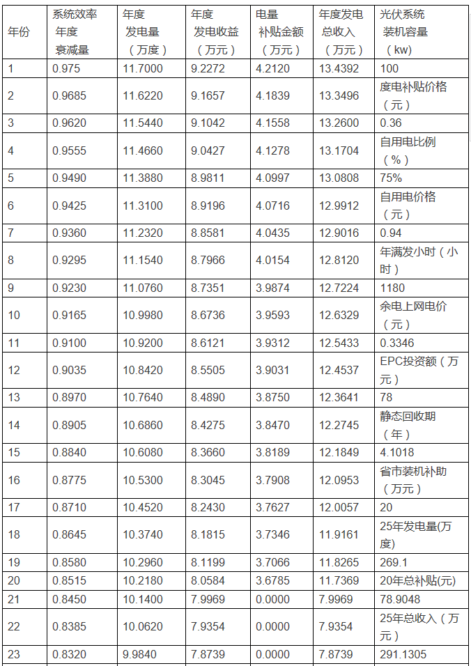 自發自用時首年/25年總收益分別為9796/204400元,回收期5.92年;全額上網時首年/25年總收益分別為9945/203000元,回收期5.83年。收益持平。