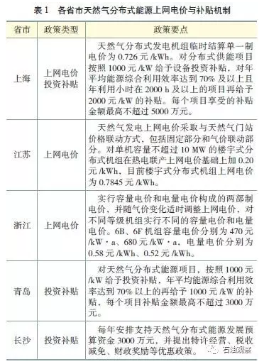 部分省份出臺(tái)了天然氣分布式能源的上網(wǎng)電價(jià)和補(bǔ)貼機(jī)制。目前上海市、江蘇省、浙江省、長(zhǎng)沙市、青島市等省市出臺(tái)了天然氣分布式能源的上網(wǎng)電價(jià)和補(bǔ)貼機(jī)制,其中上海市采用上網(wǎng)電價(jià)和投資補(bǔ)貼相結(jié)合的機(jī)制,上網(wǎng)電價(jià)為單一制電價(jià);江蘇省、浙江省均采用兩部制上網(wǎng)電價(jià)政策;青島市、長(zhǎng)沙市主要采用投資補(bǔ)貼機(jī)制。