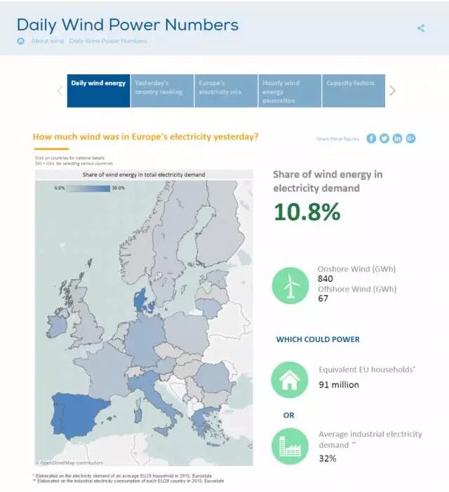 該平臺(tái)的第一個(gè)模塊顯示,風(fēng)電每天為數(shù)以百萬(wàn)計(jì)的歐洲家庭和企業(yè)提供電力。去年風(fēng)電覆蓋了歐盟電力需求的10.4%。在一些日子里,在部分成員國(guó)則覆蓋了超過(guò)100%的電力需求。