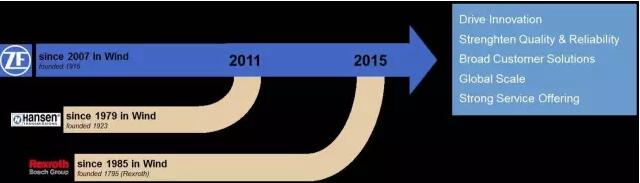 2007年,采埃孚(ZF)憑借其在車輛變速箱領(lǐng)域積累的豐富經(jīng)驗(yàn)開(kāi)始向Vestas批量供貨風(fēng)電齒輪箱;2011年,收購(gòu)Hansen;2015年,收購(gòu)Rexroth風(fēng)電齒輪箱業(yè)務(wù)。