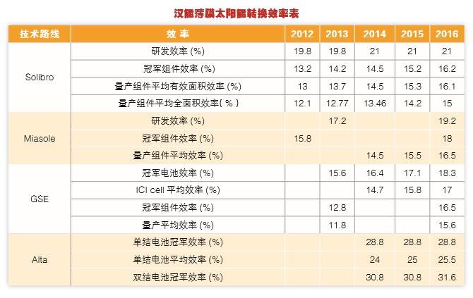 完成了并購的漢能沒有停止繼續創新的腳步,他們持續投入大量的研發資金,整合國際國內的技術資源,不斷提升薄膜太陽能電池的轉換效率,如下表。其中,AltaDevices公司的高效柔性砷化鎵薄膜發電技術是全球最薄、最輕、轉換效率最高的柔性太陽能薄膜技術,經美國國家可再生能源實驗室(NREL)認證,單結電池研發轉換效率達28.8%,雙結電池的研發轉換效率為1.6%,這也是太陽能電池技術轉換效率的世界紀錄。