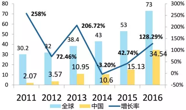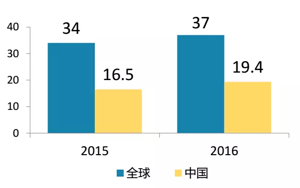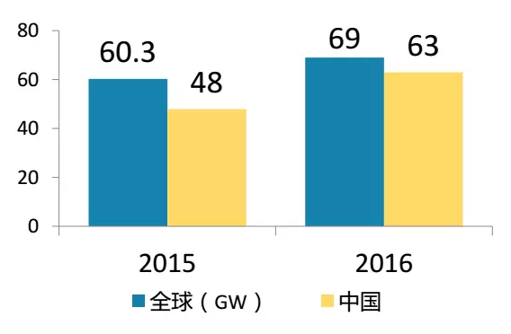 2016年中國(guó)共裝機(jī)34.54GW(連續(xù)4年第一),其中地面電站30.3GW,分布式電站4.24GW。增速大,消化前幾年項(xiàng)目是主要原因之一。