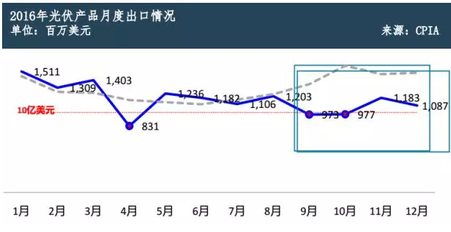 2016年月度光伏產(chǎn)品出口情況