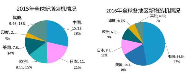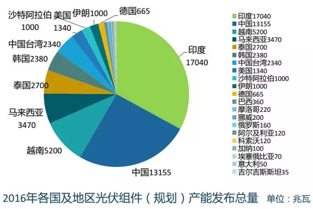 2016年全球光伏新增裝機(jī)約73GW,其中中國(guó)34.54GW,美國(guó)14.1GW、日本8.6GW、歐洲6.9GW、印度4GW。歐洲和日本等傳統(tǒng)市場(chǎng)的市場(chǎng)占比逐步向中國(guó)、美國(guó)、印度等市場(chǎng)轉(zhuǎn)移;一批新興市場(chǎng)正在加速發(fā)展。
