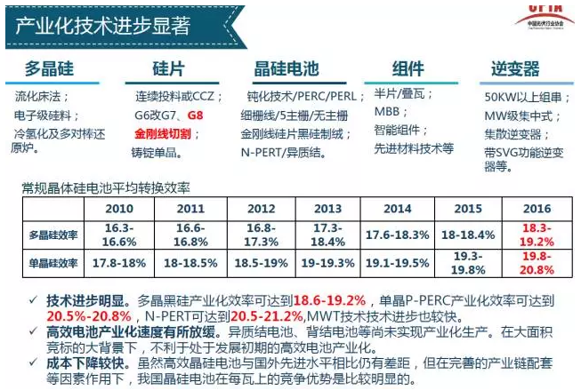 技術(shù):生產(chǎn)技術(shù)不斷進(jìn)步,PERC、黑硅等技術(shù)實(shí)現(xiàn)規(guī)模化生產(chǎn),單多晶效率分別達(dá)到20.5%和19%;