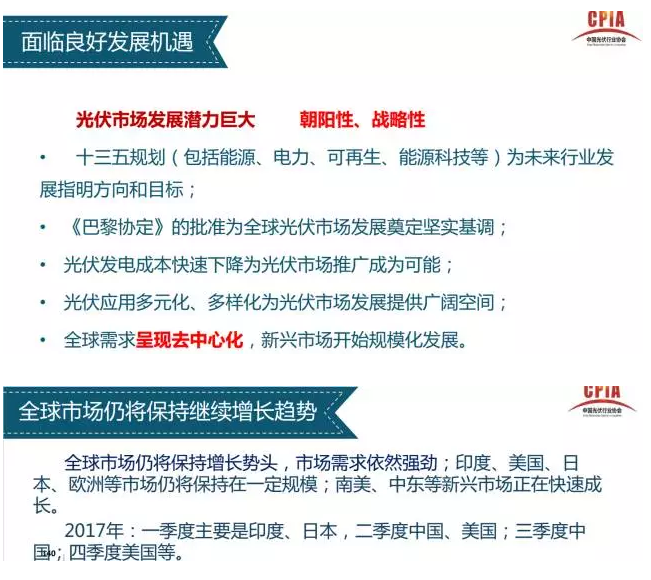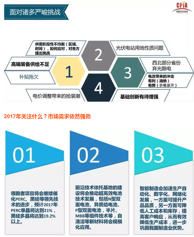 2017年2月16日,中國(guó)光伏行業(yè)協(xié)會(huì)秘書(shū)長(zhǎng)王勃華詳細(xì)介紹了2016年中國(guó)光伏產(chǎn)業(yè)的發(fā)展?fàn)顩r,并對(duì)2017年的發(fā)展趨勢(shì)進(jìn)行了預(yù)判。以下為報(bào)告的詳細(xì)內(nèi)容:
