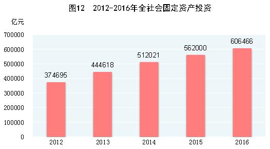 全年全社會固定資產投資606466億元,比上年增長7.9%,扣除價格因素,實際增長8.6%。其中,固定資產投資(不含農戶)596501億元,增長8.1%。分區域看[19],東部地區投資249665億元,比上年增長9.1%;中部地區投資156762億元,增長12.0%;西部地區投資154054億元,增長12.2%;東北地區投資30642億元,下降23.5%。