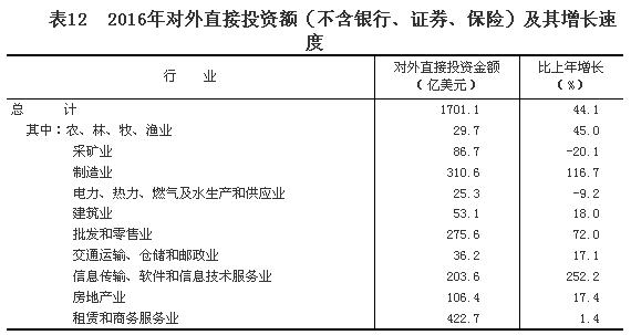 本公報中戶籍人口城鎮化率、民用汽車、交通事故數據來自公安部;城鎮新增就業、登記失業率、社會保障、技工學校數據來自人力資源社會保障部;財政數據來自財政部;外匯儲備、匯率、貨幣金融、公司信用類債券數據來自人民銀行;水產品產量數據來自農業部;木材產量、林業、森林火災數據來自林業局;灌溉面積、水資源數據來自水利部;發電裝機容量、新增220千伏及以上變電設備數據來自中電聯;新建鐵路投產里程、增新建鐵路復線投產里程、電氣化鐵路投產里程、鐵路運輸數據來自鐵路總公司;新改建公路里程、港口萬噸級碼頭泊位新增吞吐能力、公路運輸、水運、港口貨物吞吐量數據來自交通運輸部;新增民用運輸機場、民航數據來自民航局;新增光纜線路長度、電話交換機容量、電話用戶、寬帶用戶、移動互聯網接入流量、上網人數、互聯網普及率、軟件業務收入等數據來自工業和信息化部;農村地區互聯網普及率數據來自中國互聯網絡信息中心;棚戶區住房改造、農村地區建檔立卡貧困戶危房改造、城市污水處理、城市垃圾處理、城市集中供熱面積、建成區綠地數據來自住房城鄉建設部;貨物進出口數據來自海關總署;服務進出口、外商直接投資、對外直接投資、對外承包工程、對外勞務合作等數據來自商務部;管道數據來自中石油、中石化、中海油;郵政業務數據來自郵政局;旅游數據來自旅游局、公安部;上市公司數據來自證監會;保險業數據來自保監會;城鄉低保、農村特困人員救助供養、社會服務、農作物受災面積、洪澇地質災害造成直接經濟損失、旱災造成直接經濟損失、低溫冷凍和雪災造成直接經濟損失來自民政部;教育數據來自教育部;重點研發計劃、科技重大專項、國家重點實驗室、科技成果轉化引導基金、技術合同等數據來自科技部;自然科學基金項目數據來自自然基金委;國家工程研究中心、企業技術中心等數據來自發展改革委;專利數據來自知識產權局;宇航發射數據來自國防科工局;質量檢驗、國家標準制定修訂等數據來自質檢總局;藝術表演團體、博物館、公共圖書館、文化館數據來自文化部;廣播電視、電影、報紙、期刊、圖書數據來自新聞出版廣電總局;檔案數據來自檔案局;體育數據來自體育總局;殘疾人運動員數據來自中國殘聯;衛生數據來自衛生計生委;國有建設用地供應數據來自國土資源部;自然保護區、環境監測數據來自環境保護部;平均氣溫、登陸臺風數據來自氣象局;海洋災害造成直接經濟損失數據來自海洋局;地震次數、地震災害直接經濟損失數據來自地震局;安全生產數據來自安全監管總局;其他數據均來自國家統計局。