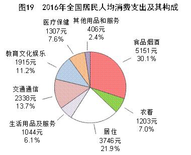 全國居民人均消費支出17111元,比上年增長8.9%,扣除價格因素,實際增長6.8%。按常住地分,城鎮居民人均消費支出23079元,增長7.9%,扣除價格因素,實際增長5.7%;農村居民人均消費支出10130元,增長9.8%,扣除價格因素,實際增長7.8%。恩格爾系數為30.1%,比上年下降0.5個百分點,其中城鎮為29.3%,農村為32.2%。