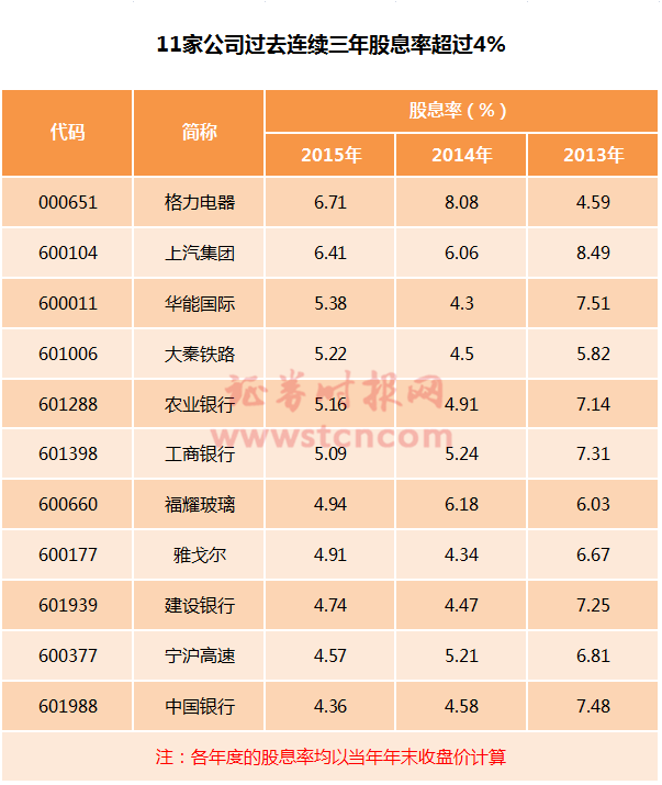 一種是從歷年來有高派息習慣的公司。梳理上市公司2013年~2015年分紅情況發(fā)現(xiàn),11家公司期間連續(xù)3年均保持分紅,并且每年股息率均超過4%。