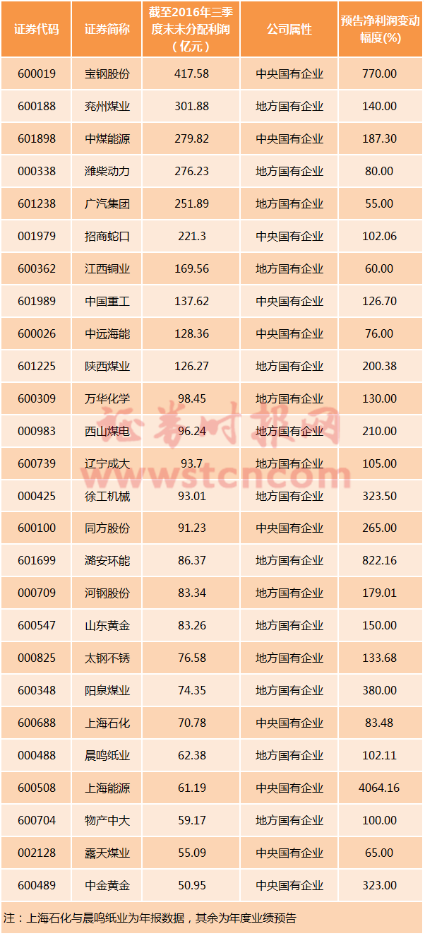 按上述條件篩選發(fā)現(xiàn),兩市共有26家央企或國企截至2016年三季度末未分配利潤超過50億元,且2016年年度業(yè)績預告增幅超過50%。