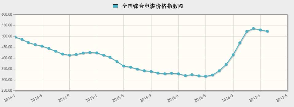 首先我們來看一下近幾年電價(jià)趨勢(shì)。3月20日,國(guó)家發(fā)改委公布了2014年1月至2017年2月電煤價(jià)格指數(shù),其趨勢(shì)變化如圖所示: