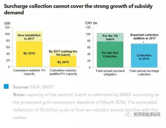 根據行業資源,2016年,中國可再生能源基金僅收到700億元附加費,這并不足以覆蓋所有項目的資金補貼需求。據彭博新能源財經估算,在不考慮消納的情況下,如果包括第七批可再生能源補貼目錄,中國可再生能源基金年度支付需求超過1000億人民幣。